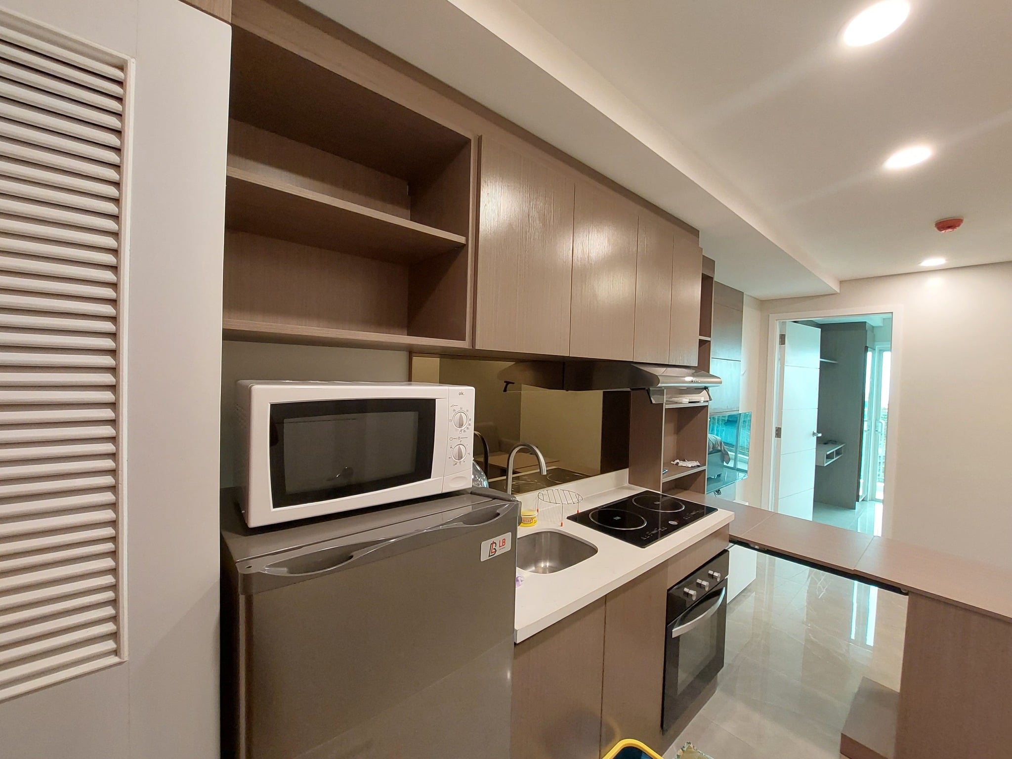 ✔️ Functional kitchen with stone countertop, kitchen cabinets, induction stove, range hood, microwave, refrigerator, multicooker, and built-in oven