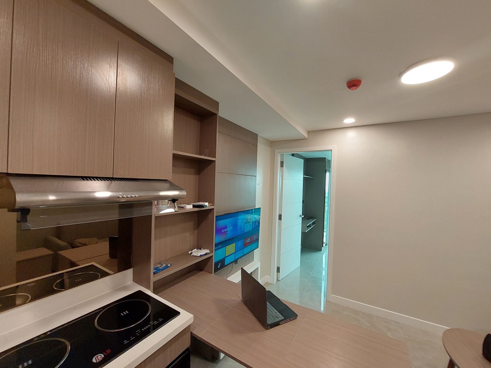 ✔️ Stylish living room with sofa, smart TV, soundbar, TV wall, and split-type aircon