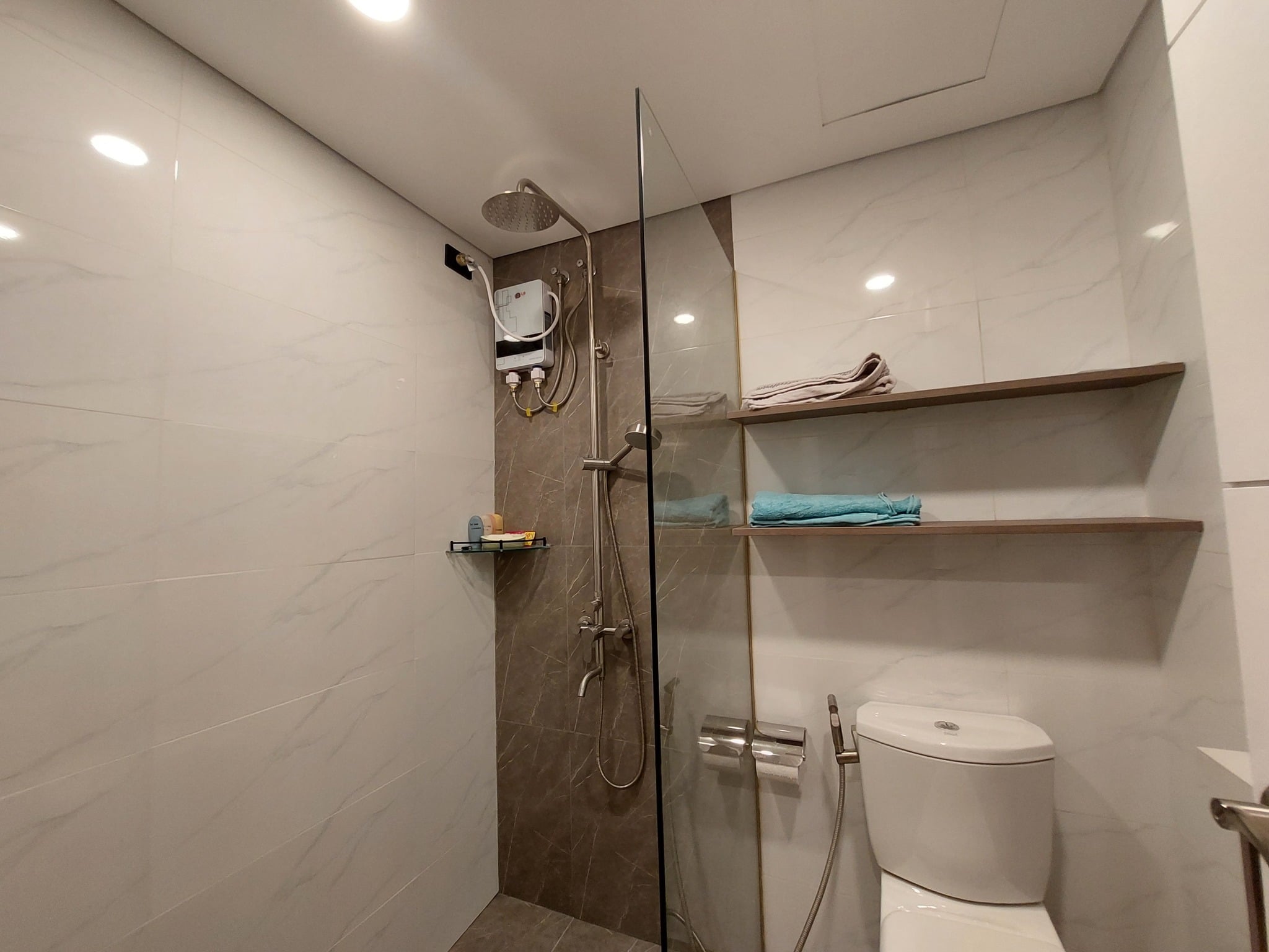 ✔️ Bathroom with shower enclosure, water heater, vanity counter, and bidet