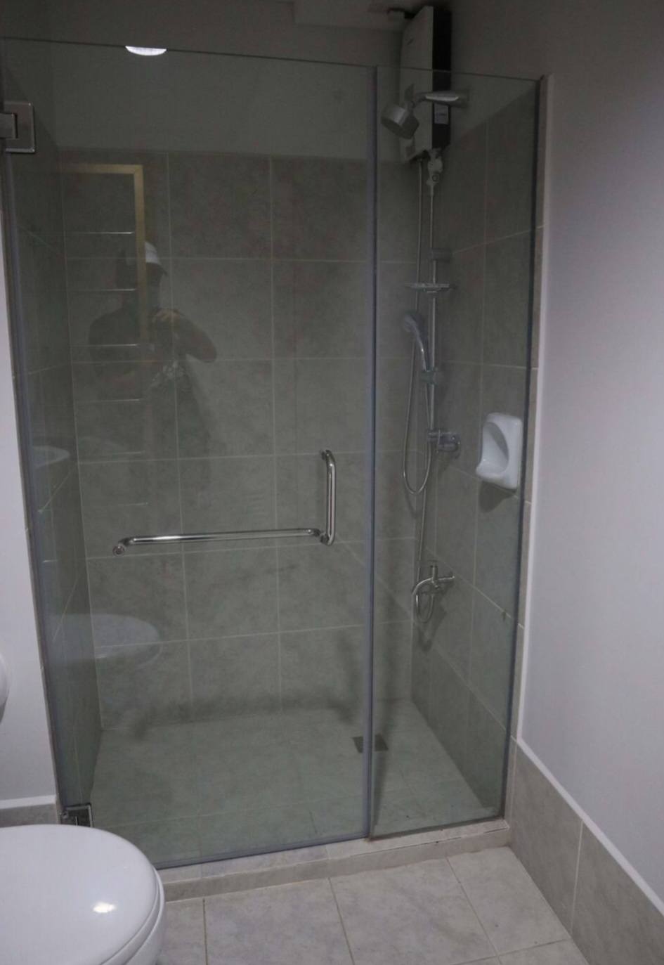 • Bathroom with glass shower enclosure & water heater