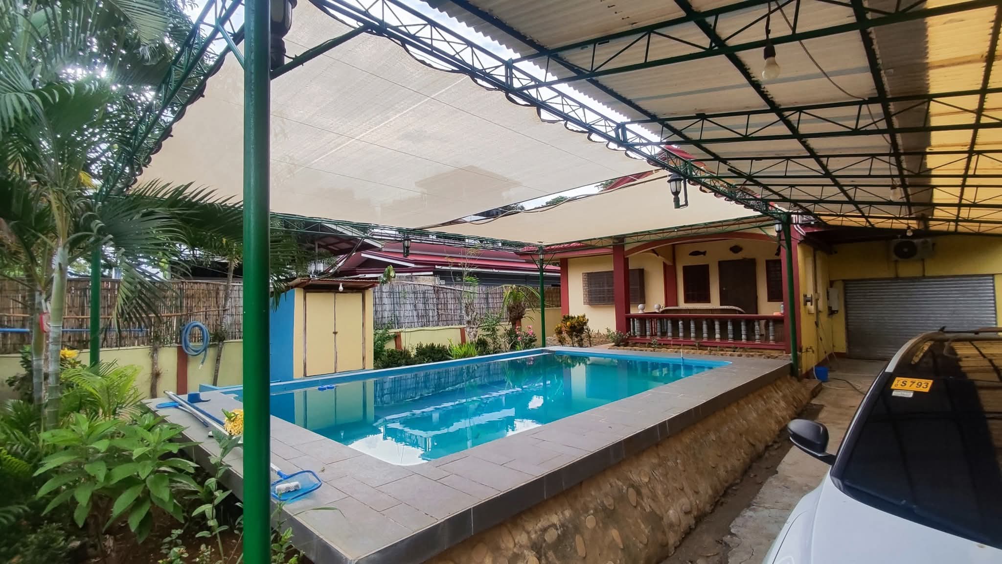 A pool with a dimension of 4x7 meters and 1.5-2 meters deep, pump is completely running on solar..